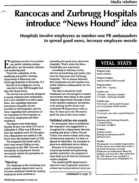 Profiles in Healthcare Marketing, September/October 1995 News Hound Program involves employees, increases media coverage.